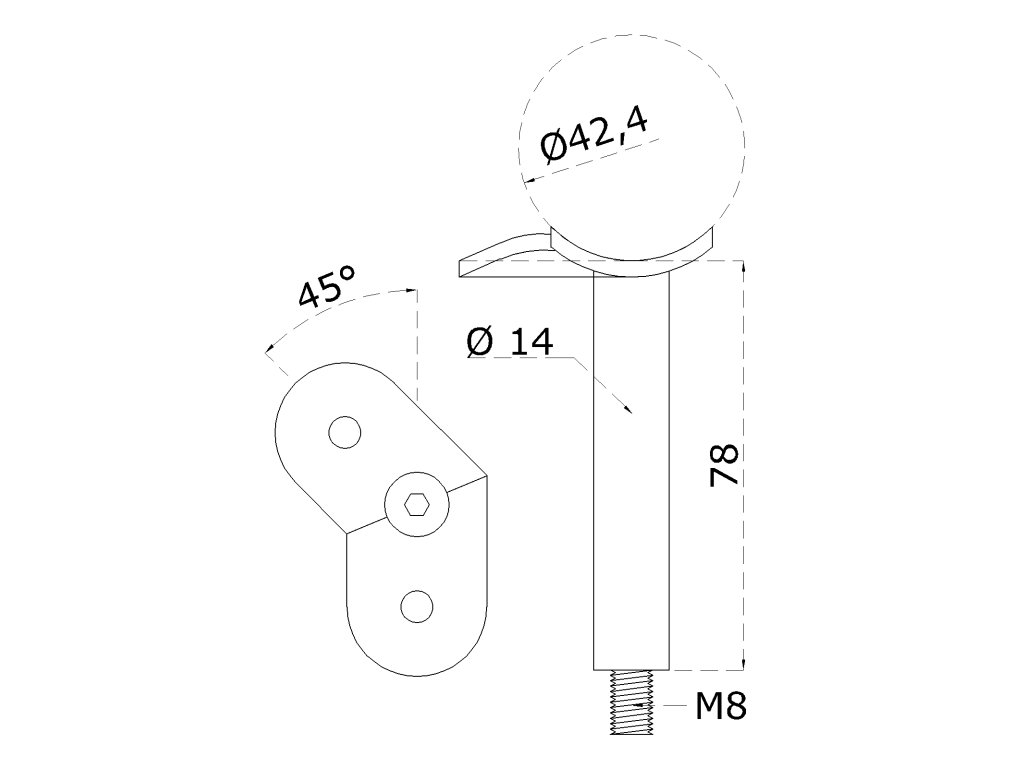 držiak madla (45° uhol) na trubku ø 42.4mm (78mm /závit M8), brúsená nerez K320 /AISI304