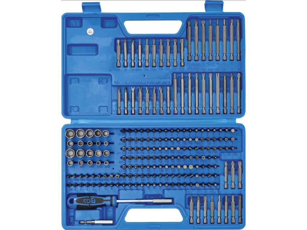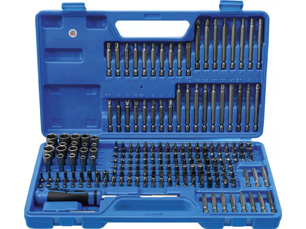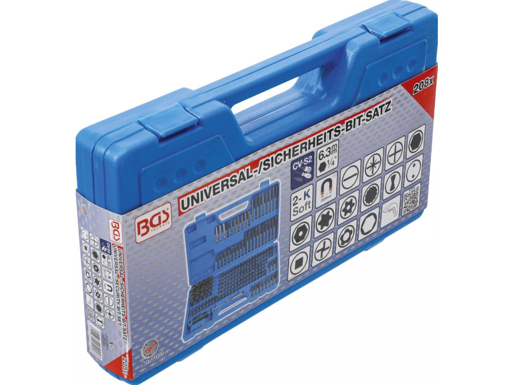 Komplexná 208-dielna sada bitov, pokrývajúca široké spektrum profilov od drážkových, krížových (PH, PZ), Torx, Torx Plus, vnútorných šesťhranných, štvorhranových až po špeciálne profily (clutch, XZN, krídla). Obsahuje rôzne dĺžky aj veľkosti vrátane bitov s otvormi — ideálna pre univerzálne použitie aj v najnáročnejších situáciách. Dodáva sa aj so skrutkovacou rukoväťou, magnetickým držiakom a račňovým adaptérom.