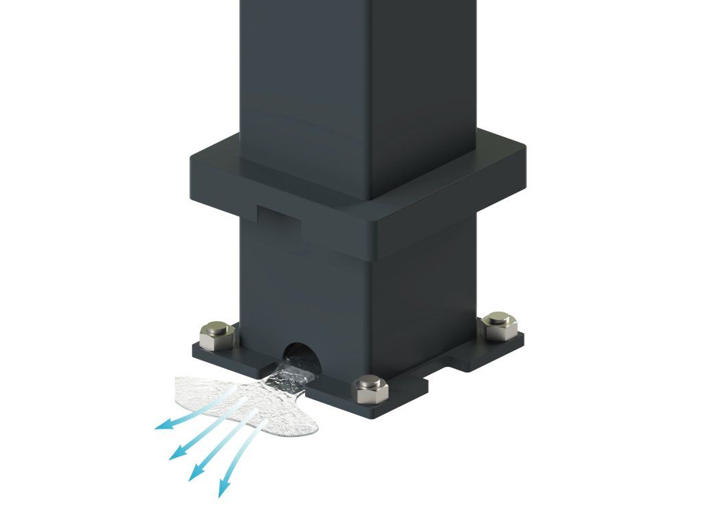 Nosné stĺpy majú rozmery 116 × 116 mm. Pri montáži treba počítať s oceľovou pätkou 160 × 160 mm (hrúbka 8 mm), prekrytou hliníkovým krytom 165 × 165 mm s integrovaným odvodnením.