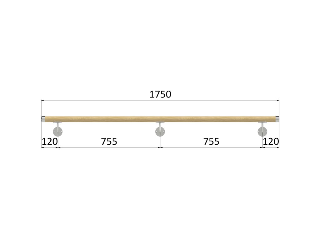 madlo drevené (1750mm), materiál: buk, brúsený povrch s náterom BORI (bezfarebný), set: 3 ks úchyt, madlo s nerezovým ukončením