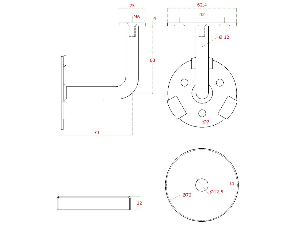 držiak madla na stenu s krytkou kotviacej platne (pevný, plochý), odsadenie 73 mm, oceľ bez povrchovej úpravy