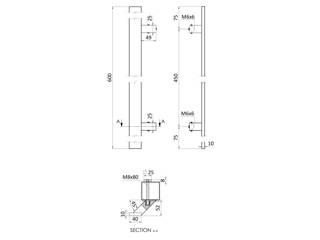 Madlo 45°, L = 600 mm, brúsená AISI304
