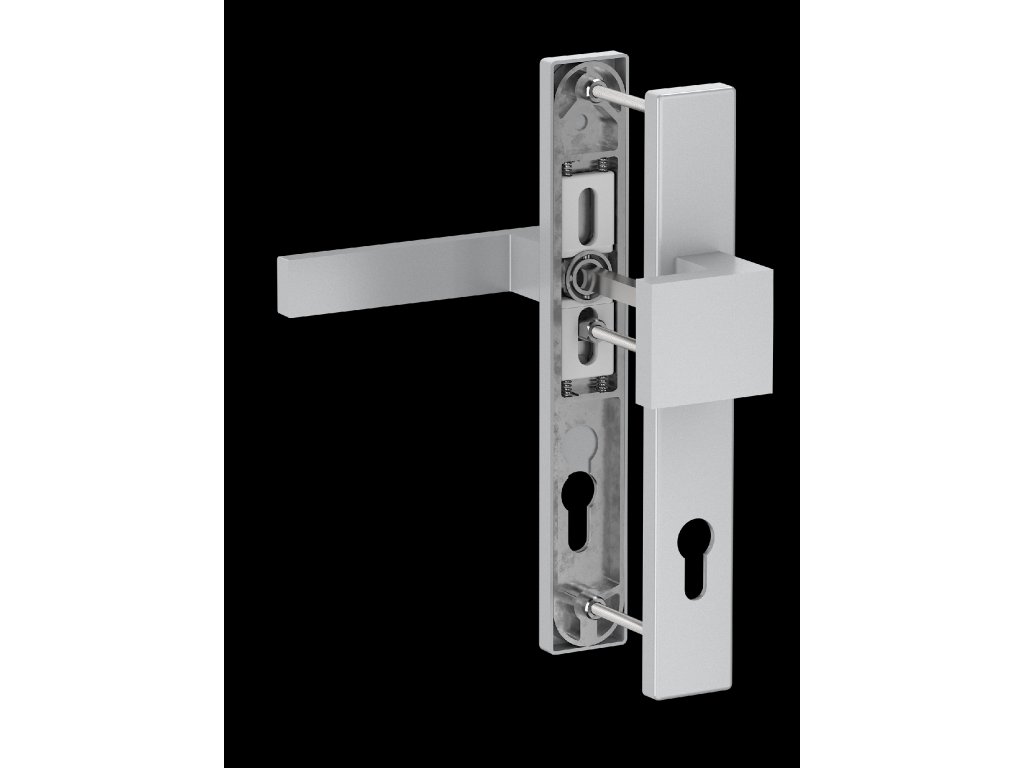 Kompletná sada hliníkového kovania v štítovom prevedení, určená pre vstupné dvere, brány a bránky. Sada kombinuje pohyblivú kľučku na vnútornej strane a pevnú guľu na vonkajšej strane. Toto riešenie zvyšuje bezpečnosť, pretože z vonkajšej strany je na otvorenie dverí vždy nutné použiť kľúč. Štítové prevedenie elegantne zakrýva zadlabávací zámok a montážne otvory, čím vytvára čistý a ucelený vzhľad.Výhody
