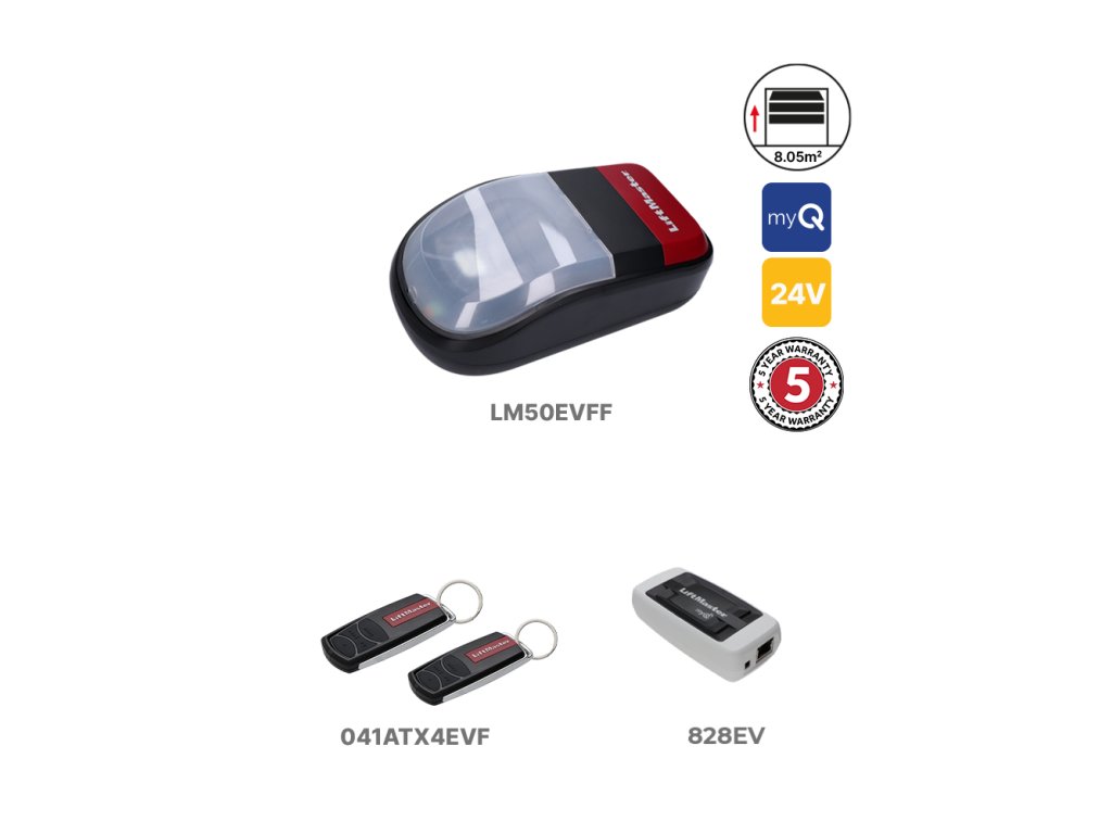 LiftMaster LM50EVFF1 je kompaktný a spoľahlivý 24V pohon pre garážovú sekčnú bránu do hmotnosti 80 kg, so šírkou brány do 3,5 metra, s výškou brány 2,3 metra. Pohon má integrované LED osvetlenie a kompaktný, moderný dizajn. Pohon podporuje technológiu myQ, ktorá umožňuje ovládanie brány odkiaľkoľvek prostredníctvom smartfónu, tabletu alebo počítača.Kovian s.r.o. Vám ponúka na pohon LM50EVFF-1 záruku predĺženú o 1 rok (predĺžená záruka 3 roky)