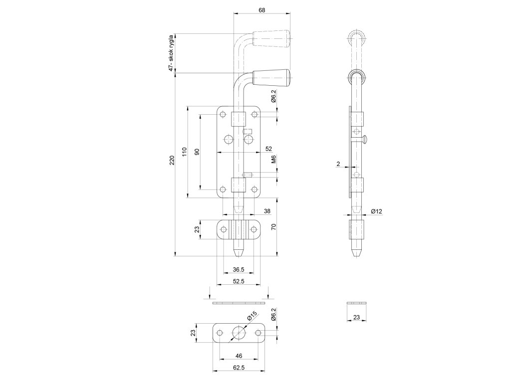 rígeľ ø 12mm, L: 220mm, povrch čierny lak s protikusom