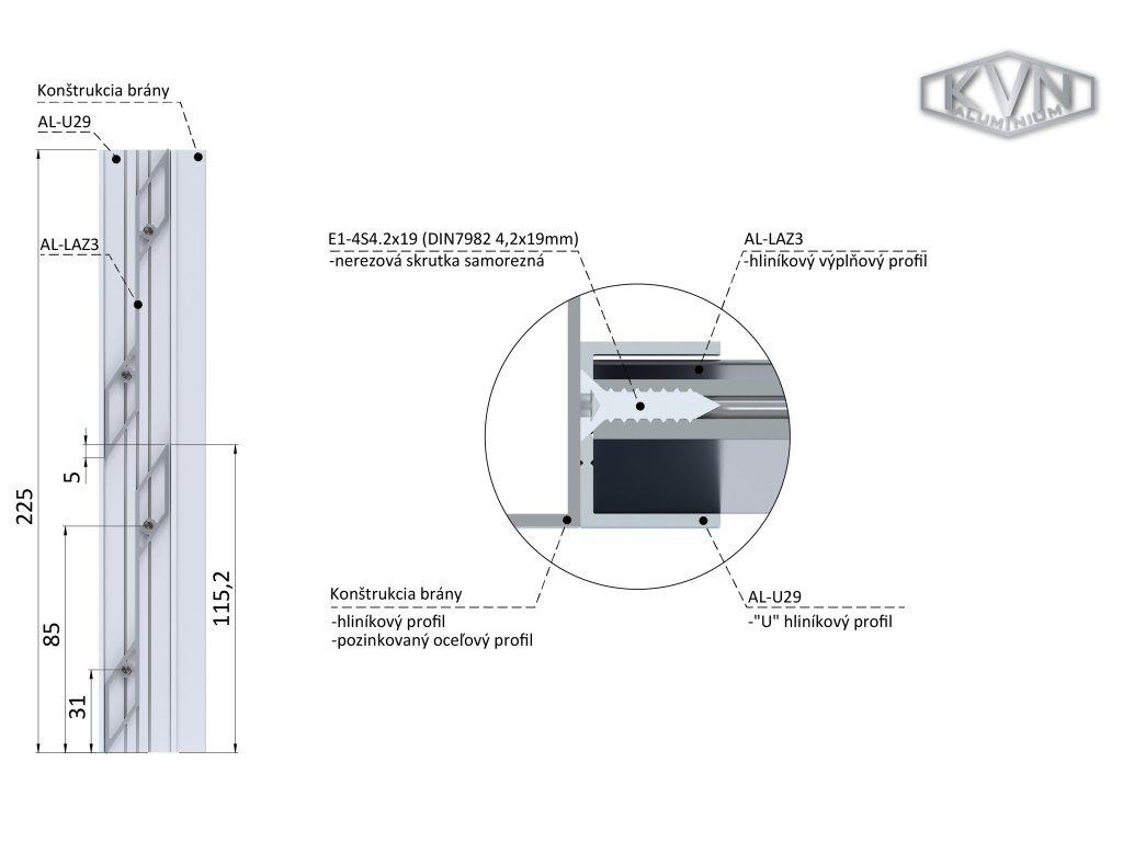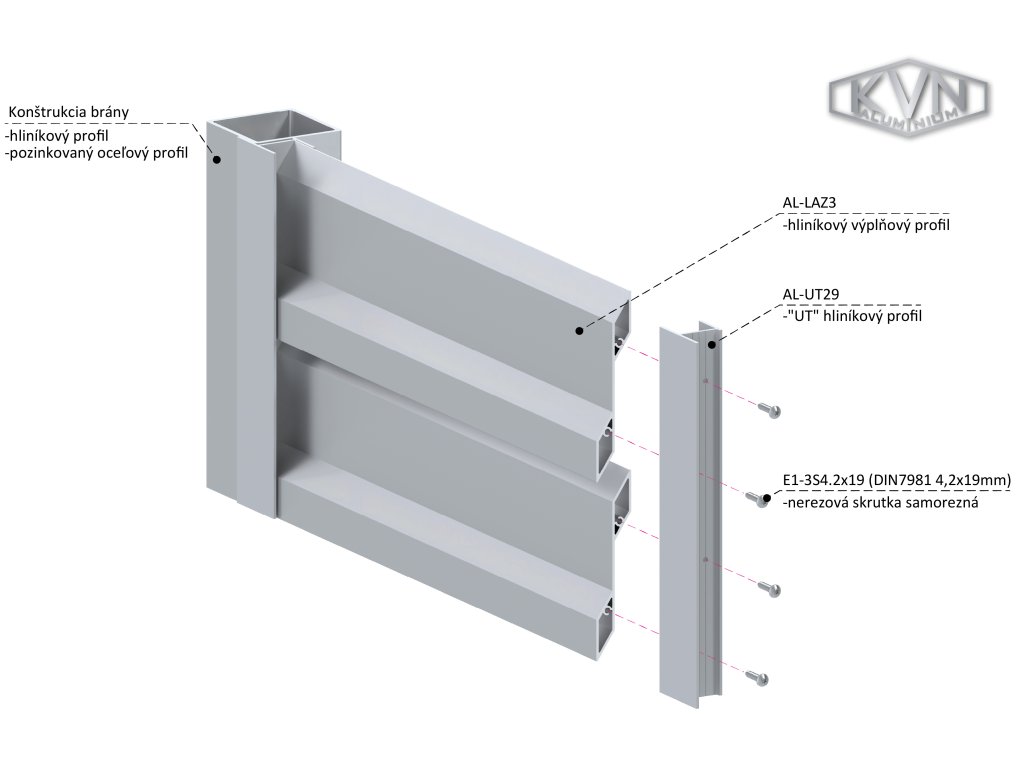 Pokiaľ sa rozhodnete spájať viac polí s lamelovou výplňou, odporúčame Vám využiť spojovacie UT profily. V našej ponuke nájdete UT profily so šírkou 29mm AL-UT29-6 a 50 mm AL-UT50-6 a vodiacimi čiarami pre jednoduchú montáž a ideálne umiestnenie lamely AL-LAZ3-6. Najvhodnejšími skrutkami pre prichytenie UT profilov k lamelám sú samorezné skrutky s polguľatou hlavou E1-3S4.2
