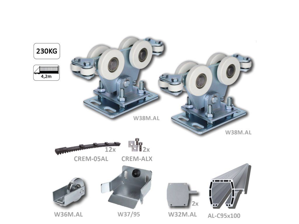 hliníkový samonosný systém 95x100x11mm, posuvnej brány do 150kg/6,5m otvor (AL-C95x100-6,1x W-SET95AL, 12x CREM-05, 1 pár CREM-ALX)
