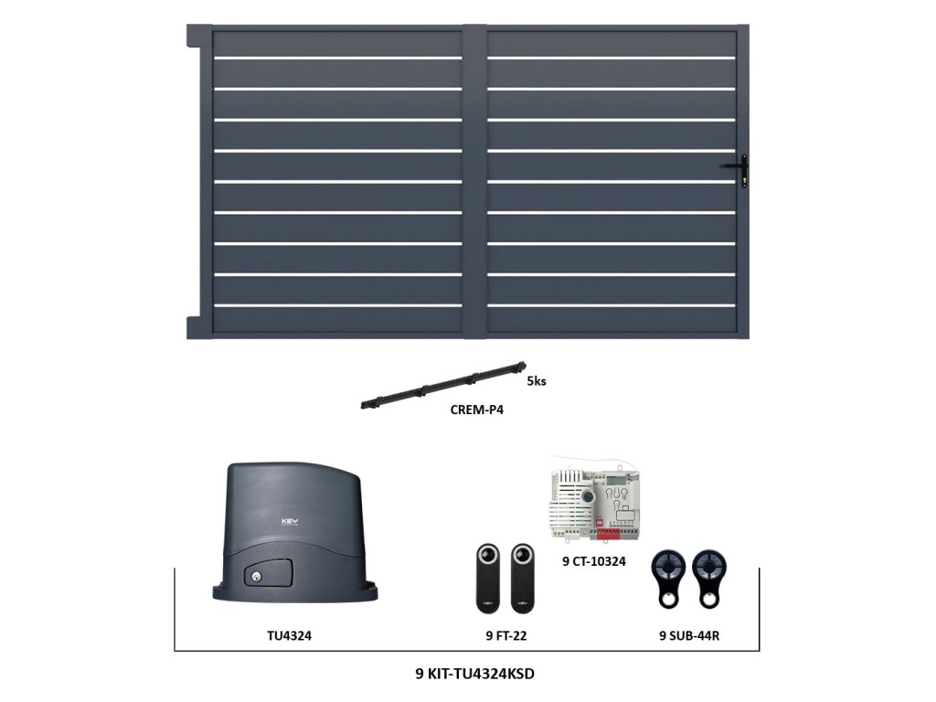 Tento konkrétní produkt nabízíme jako kompletní set včetně pohonu 9 KIT-TU4324KSD a 5 ks ozubeného hřebene CREM-P4 pro automatický provoz brány.