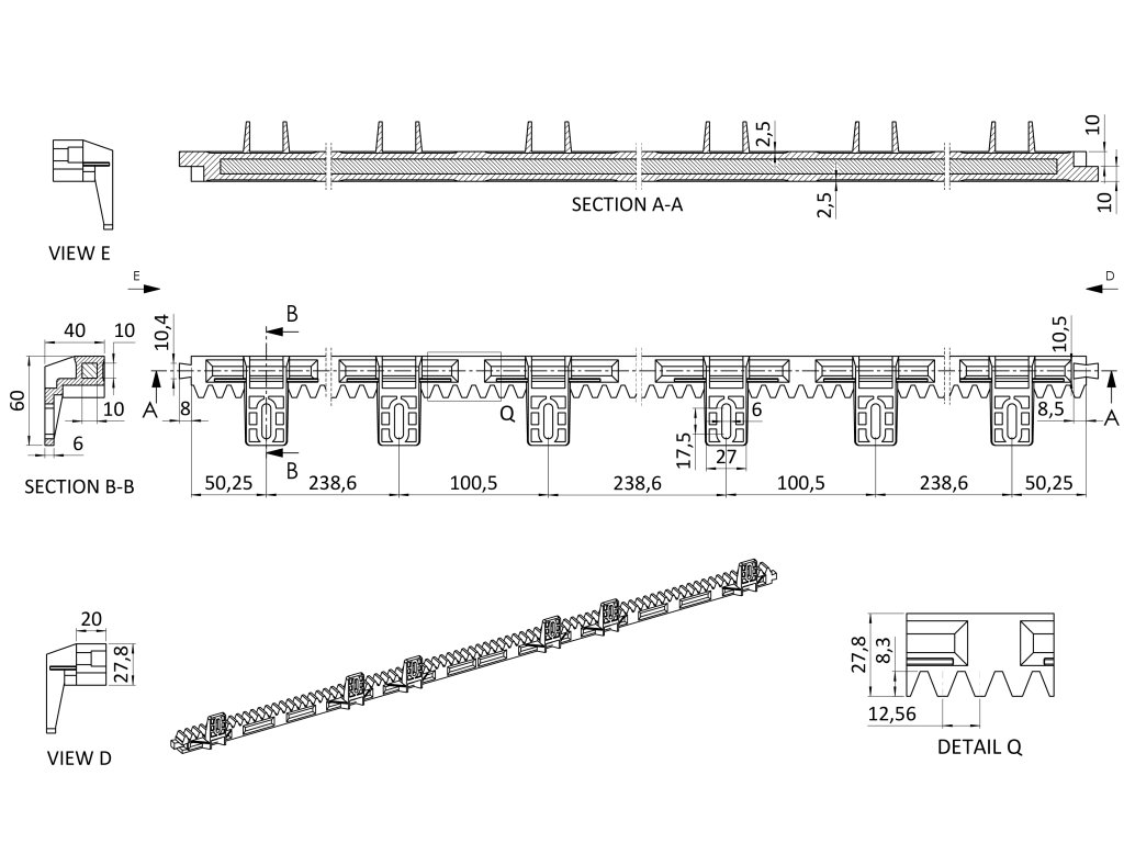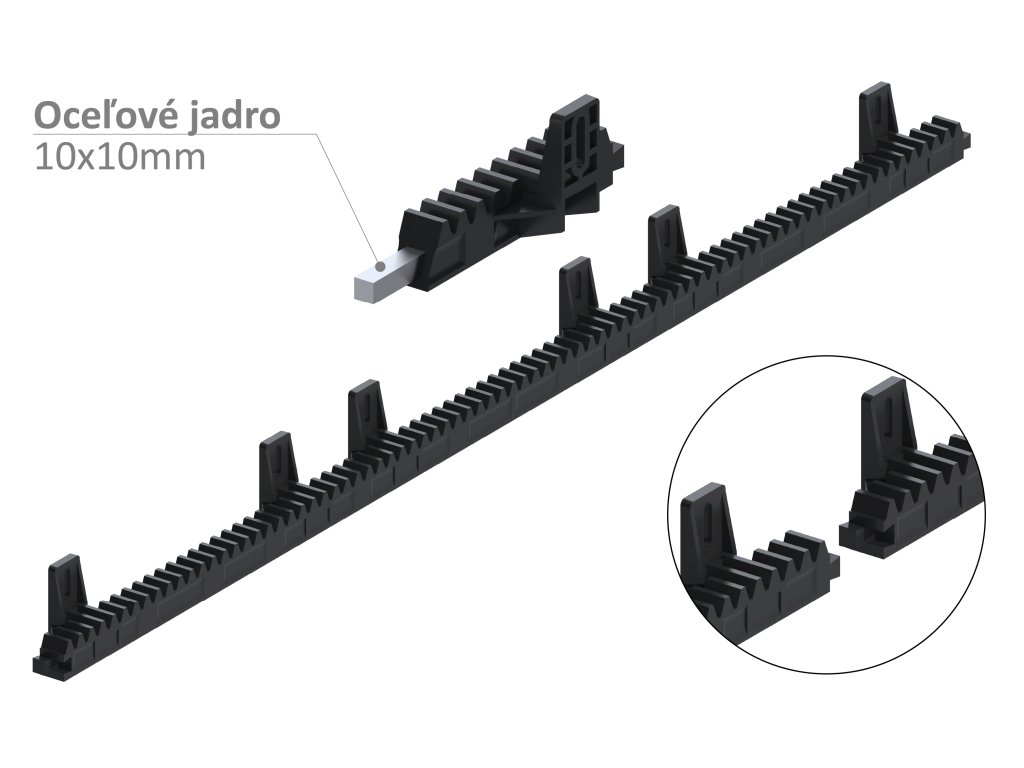 Kvalitný ozubený nylonový hrebeň s oceľovou výstuhou je určený pre pohony posuvných brán s maximálnou hmotnosťou do 700 kg. Vďaka kombinácii pevného oceľového jadra a odolného nylonového povrchu zaručuje tichý, plynulý a spoľahlivý chod brány.