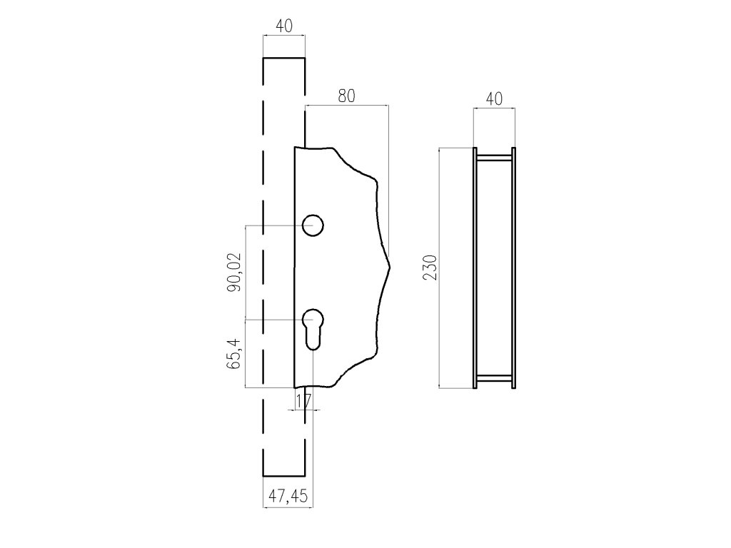 Kazetová zostava pre bránku 230x93x40mm, otvor pre kľučku ø 20mm, na profil 40x40mm, zdobená, pre zámok ZM90/80