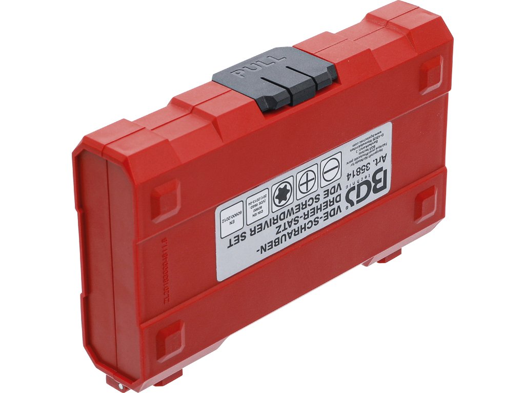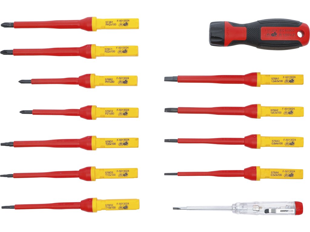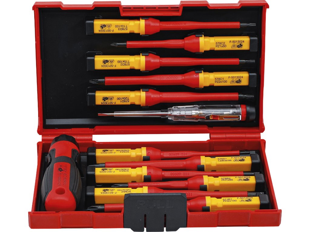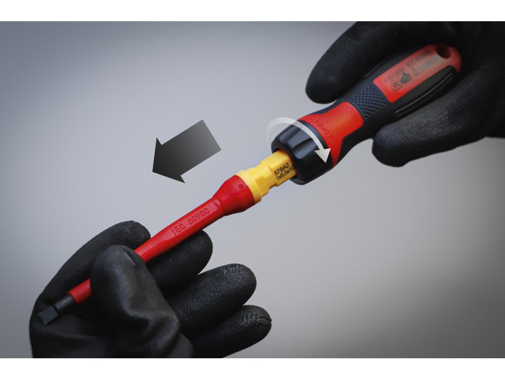 1x VDE rukojeť s vymeniteľným držiakom čepelí, s 2-komponentnou rukoväťou (červeno/žltá).