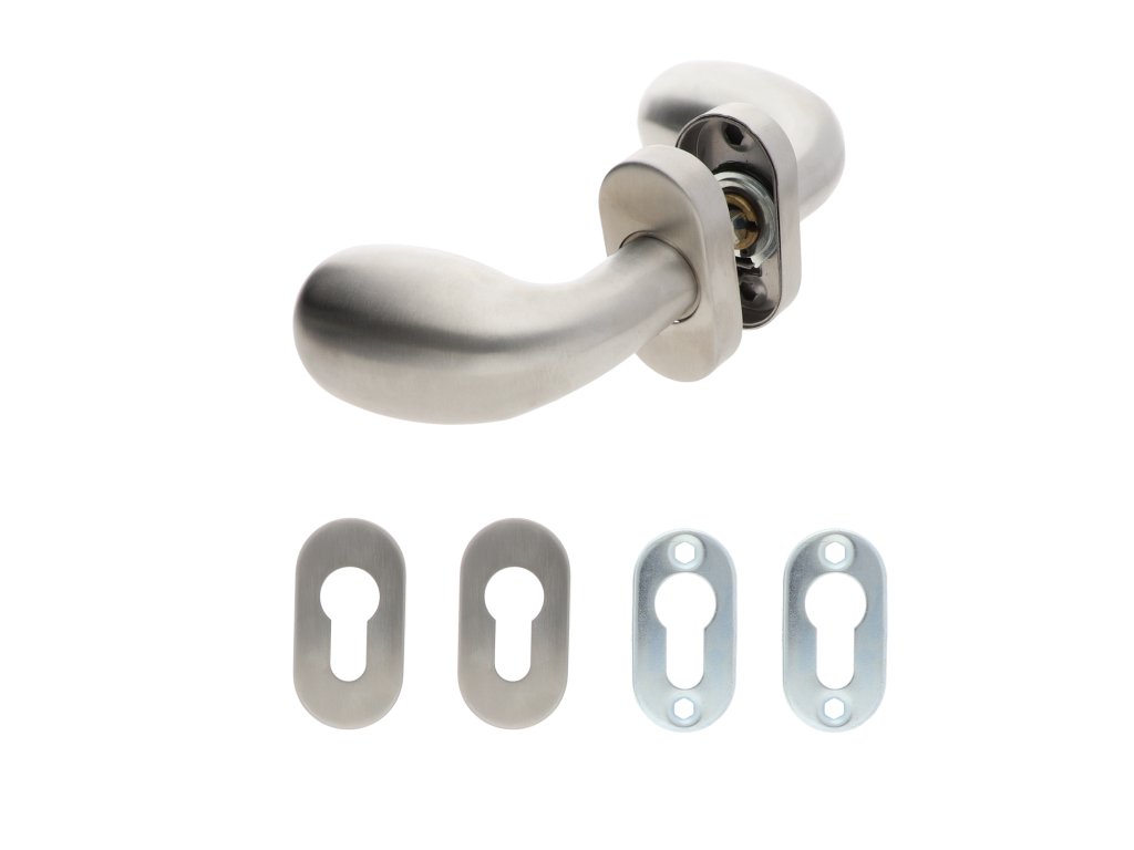oválna nerezová kľučka (pár) vrátane dolnej rozety, balenie: 2ks kľučka + 2ks dolná rozeta, príslušenstvo k montáži, brúsená nerez K320 /AISI304Dodatočné parametre