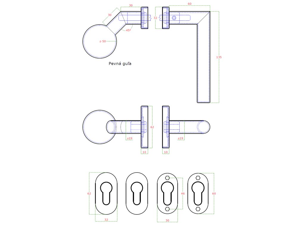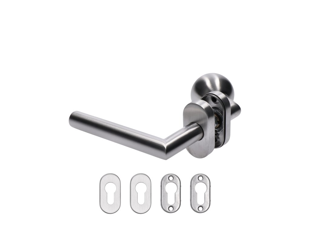 Kľučka (ľavá) + guľa (pevná), vyhnutá vrátane dolnej rozety, balenie: 1ks kľučka (ľavá), 1ks guľa, 2ks dolná oválna rozeta,brúsená nerez AISI304