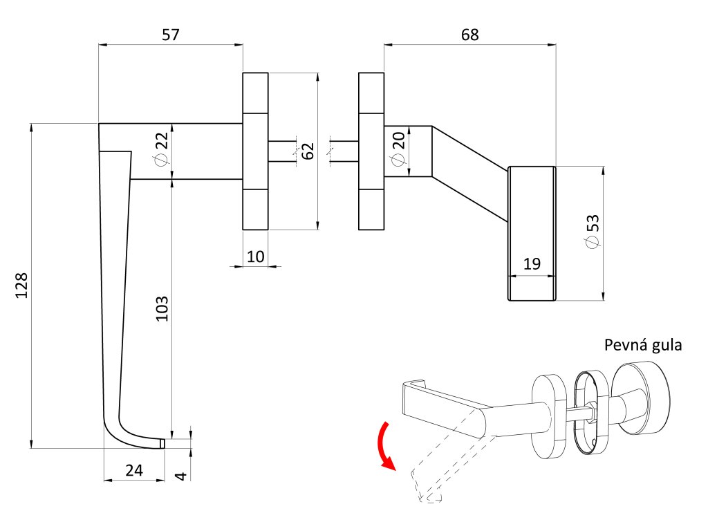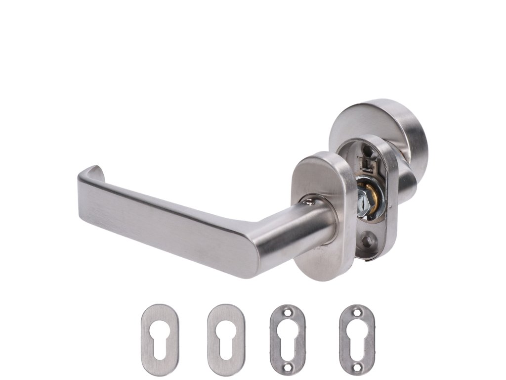 kľučka (ľavá) + guľa oválna (pevná), vyhnutá vrátane dolnej rozety, balenie: 1ks kľučka (ľavá), 1ks guľa oválna, 2ks dolná oválna rozeta,brúsená nerez AISI304