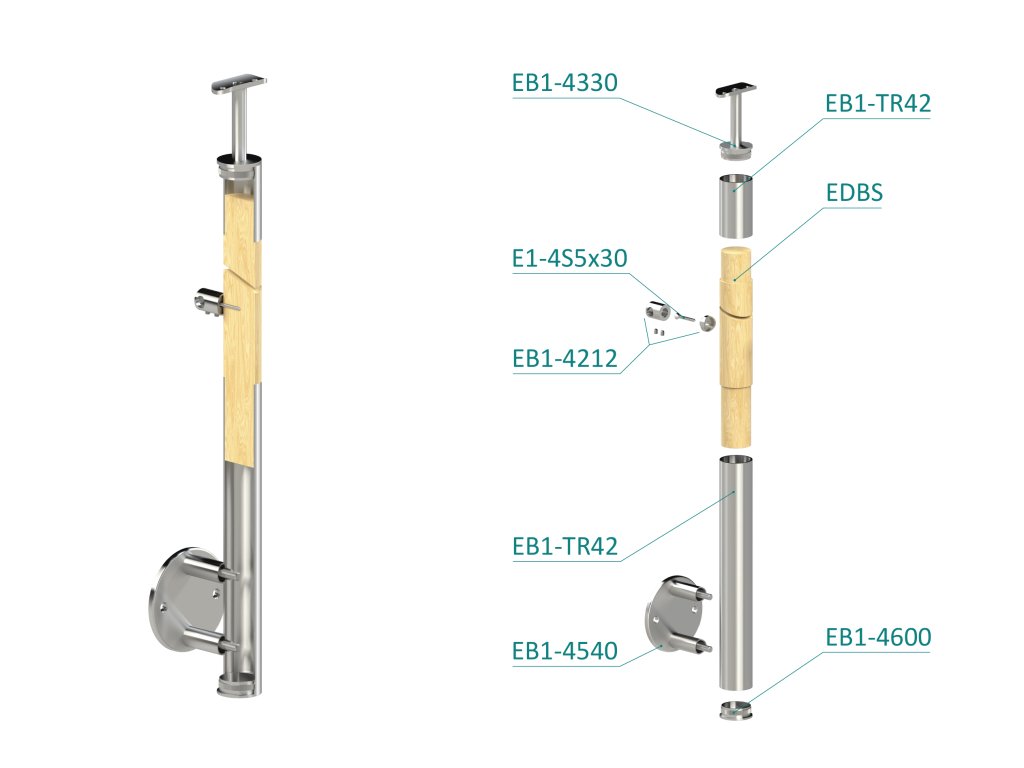 drevený stĺp, bočné kotvenie, 4 radový, priechodný, vnútorný, vrch pevný (ø 42mm), materiál: buk, brúsený povrch s náterom BORI (bezfarebný)