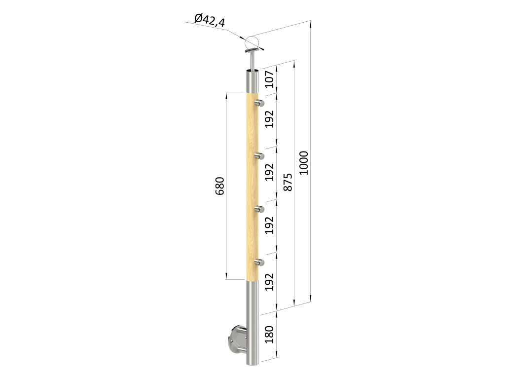 drevený stĺp, bočné kotvenie, 4 radový, priechodný, vonkajší, vrch pevný (ø 42mm), materiál: buk, brúsený povrch s náterom BORI (bezfarebný)
