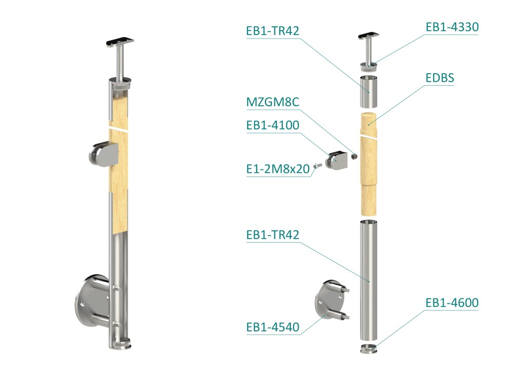 drevený stĺp, bočné kotvenie, výplň: sklo, ľavý, vrch pevný (ø 42mm), materiál: buk, brúsený povrch bez náteru