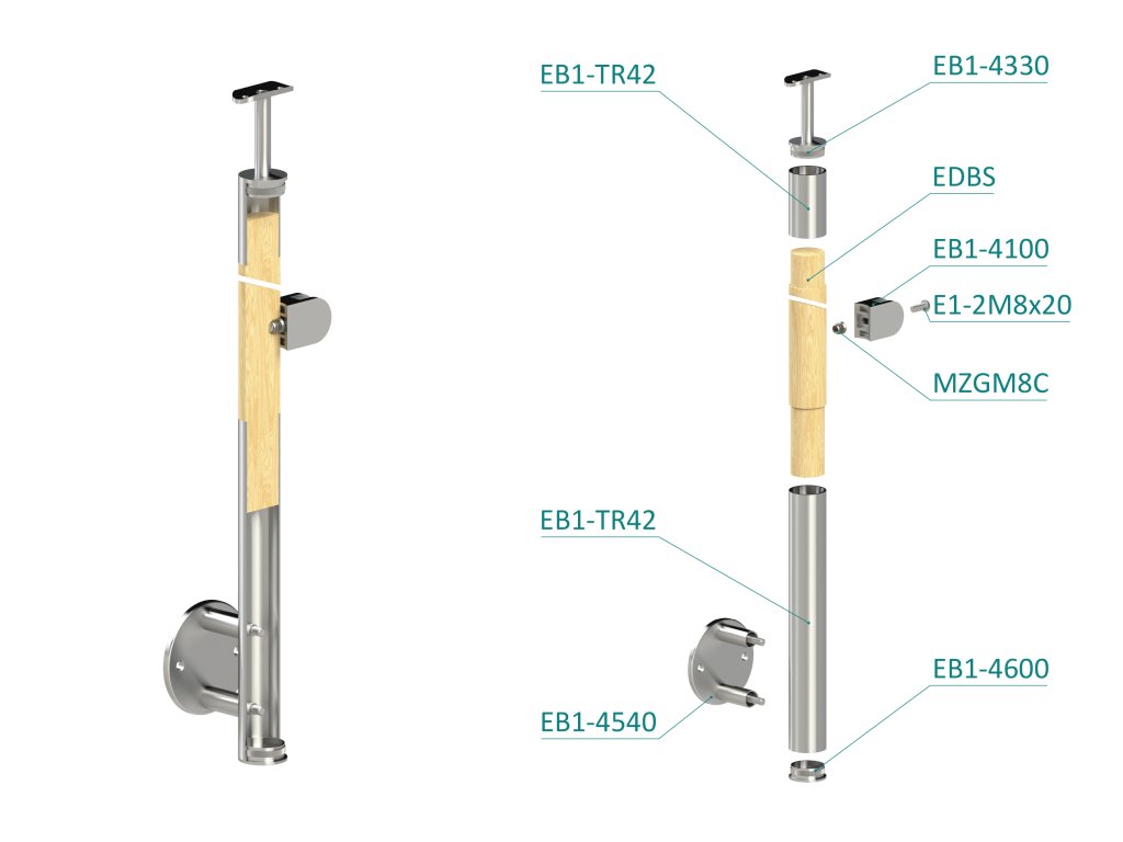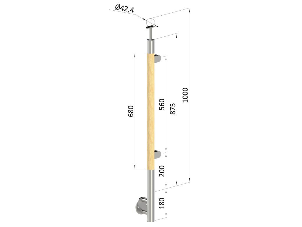 drevený stĺp, bočné kotvenie, výplň: sklo, pravý, vrch pevný (ø 42mm), materiál: buk, brúsený povrch bez náteru