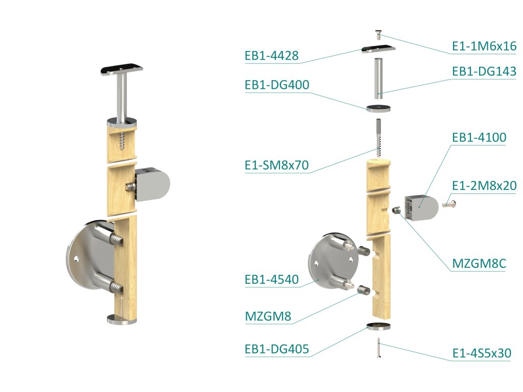 drevený stĺp, bočné kotvenie, výplň: sklo, pravý, vrch pevný (ø 42mm), materiál: buk, brúsený povrch s náterom BORI (bezfarebný)Dodatočné parametre
