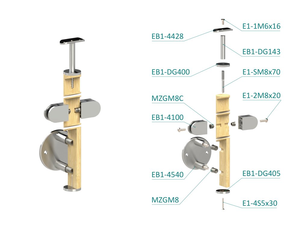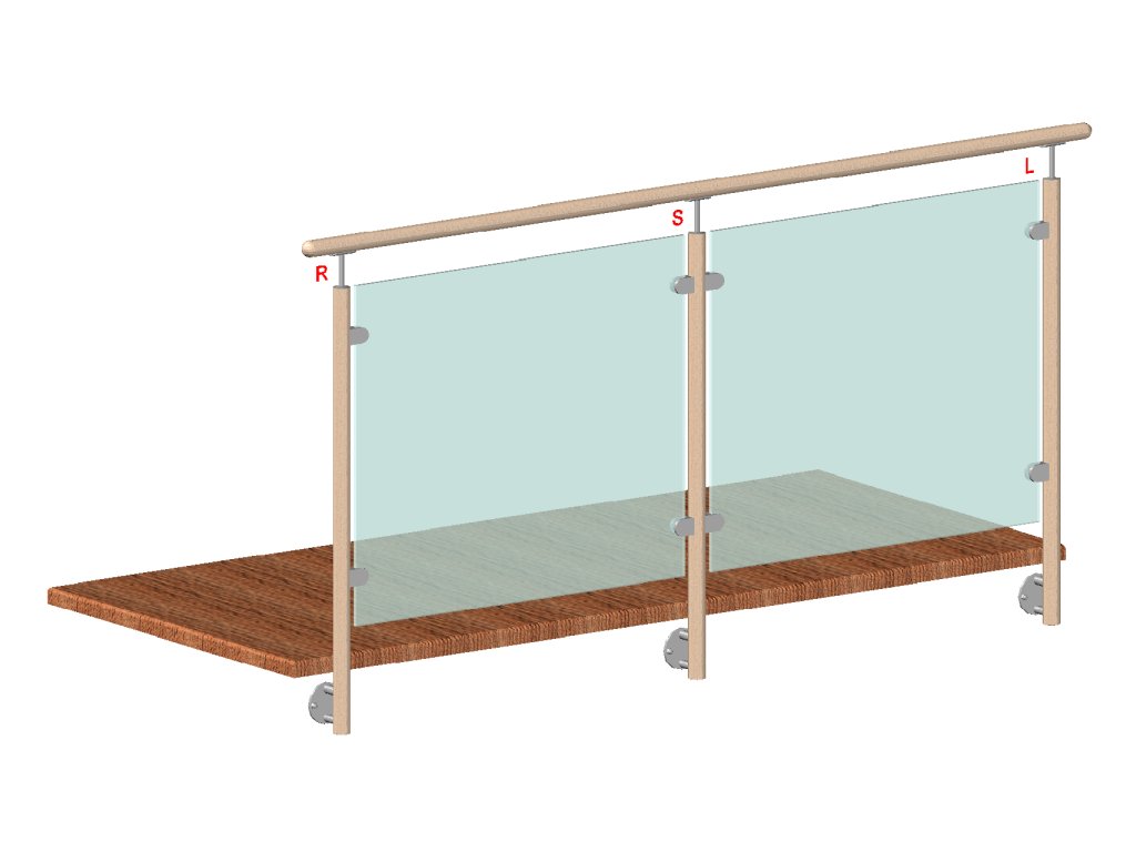 drevený stĺp, bočné kotvenie, výplň: sklo, priechodný, vrch pevný (ø 42mm), materiál: buk, brúsený povrch bez náteruDodatočné parametre