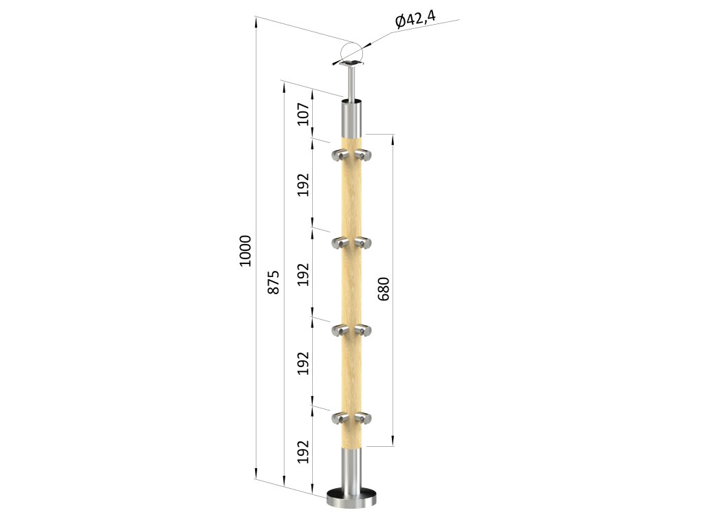 drevený stĺp, vrchné kotvenie, 4 radový, priechodný, rohový: 90°, vrch pevný (ø 42mm), materiál: buk, brúsený povrch bez náteru