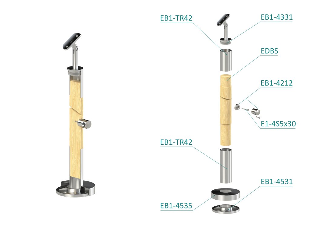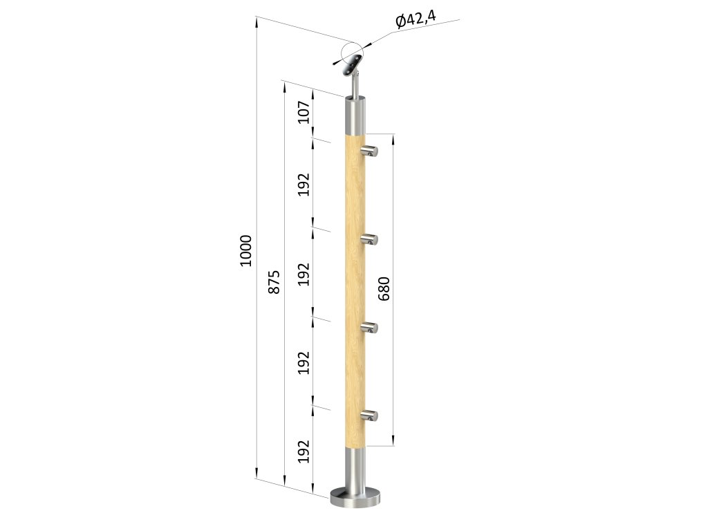 drevený stĺp, vrchné kotvenie, 4 radový, priechodný, vrch nastaviteľný (ø 42mm), materiál: buk, brúsený povrch s náterom BORI (bezfarebný)