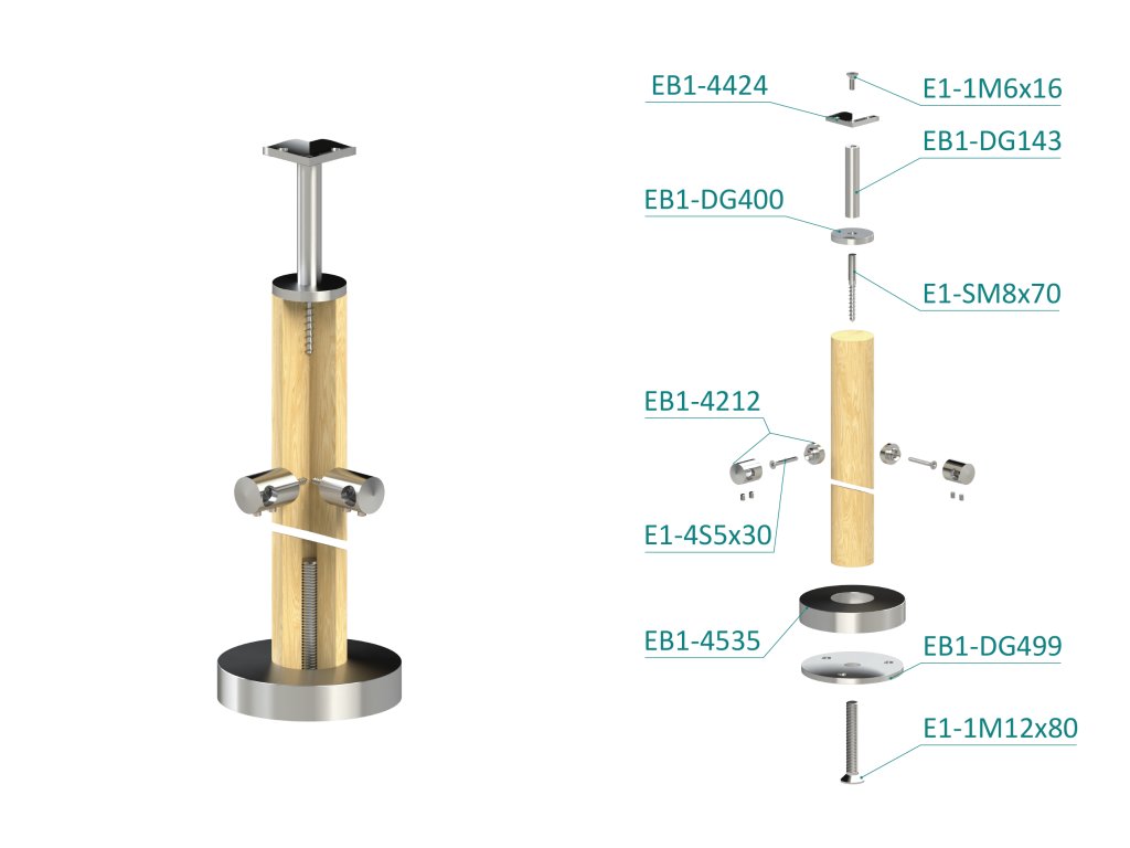 drevený stĺp, vrchné kotvenie, 4 radový, rohový: 90°, vrch pevný (ø 42mm), materiál: buk, brúsený povrch bez náteruDodatočné parametre