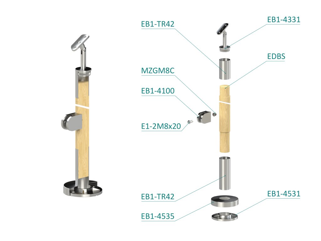 drevený stĺp, vrchné kotvenie, výplň: sklo, ľavý, vrch nastaviteľný (ø 42mm), materiál: buk, brúsený povrch bez náteru