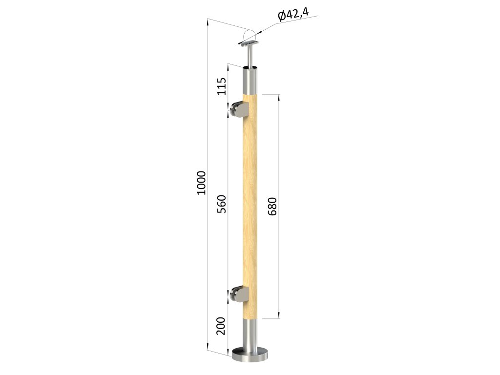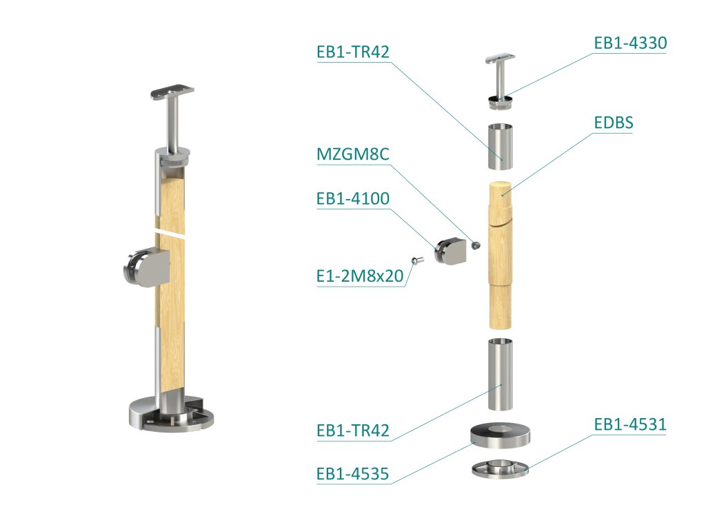 drevený stĺp, vrchné kotvenie, výplň: sklo, ľavý, vrch pevný (ø 42mm), materiál: buk, brúsený povrch s náterom BORI (bezfarebný)