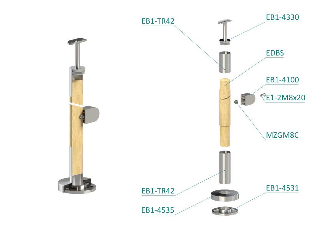 drevený stĺp, vrchné kotvenie, výplň: sklo, pravý, vrch pevný (ø 42mm), materiál: buk, brúsený povrch bez náteru