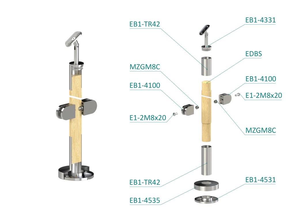 drevený stĺp, vrchné kotvenie, výplň: sklo, priechodný, vrch nastaviteľný (ø 42mm), materiál: buk, brúsený povrch bez náteru