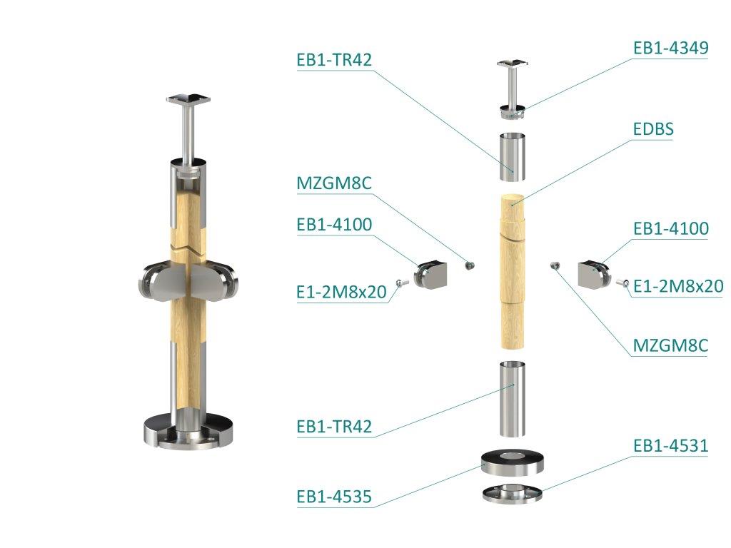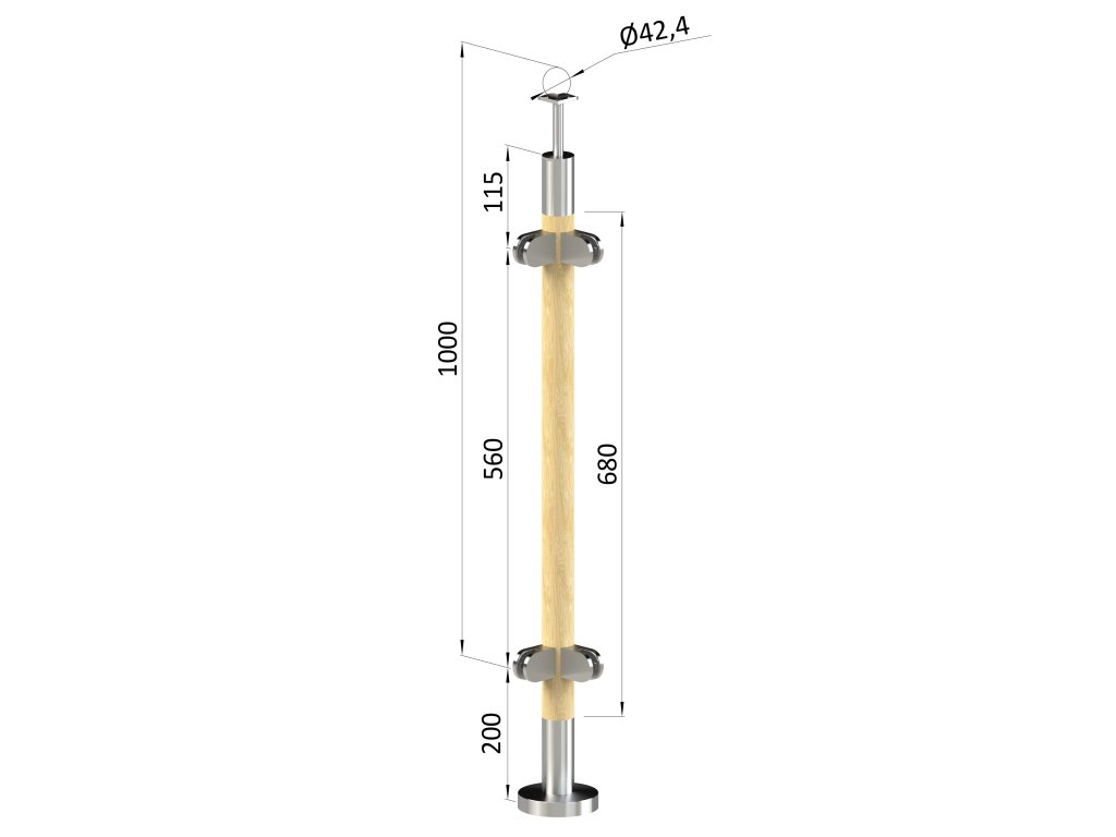 drevený stĺp, vrchné kotvenie, výplň: sklo, rohový, vrch pevný (ø 42mm), materiál: buk, brúsený povrch s náteromn BORI (bezfarebný)