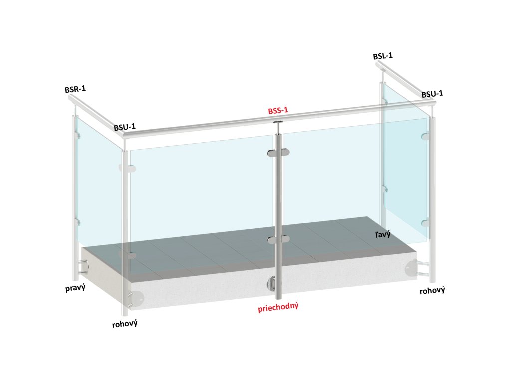 nerezový stĺp, bočné kotvenie, výplň: sklo, priechodný, vrch pevný (ø 42.4x2mm), brúsená nerez K320 /AISI316Dodatočné parametre