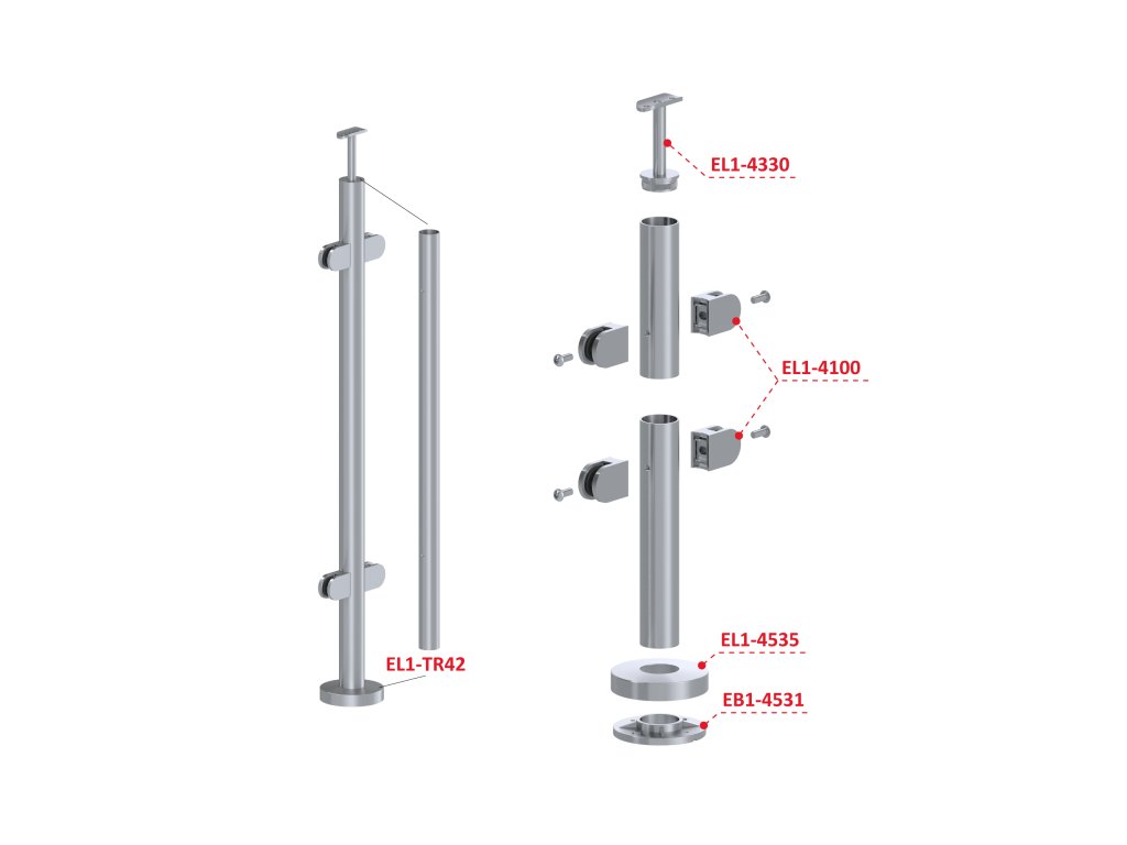nerezový stĺp, vrchné kotvenie, výplň: sklo, priechodný, vrch pevný (ø 42.4x2mm), leštená nerez /AISI304