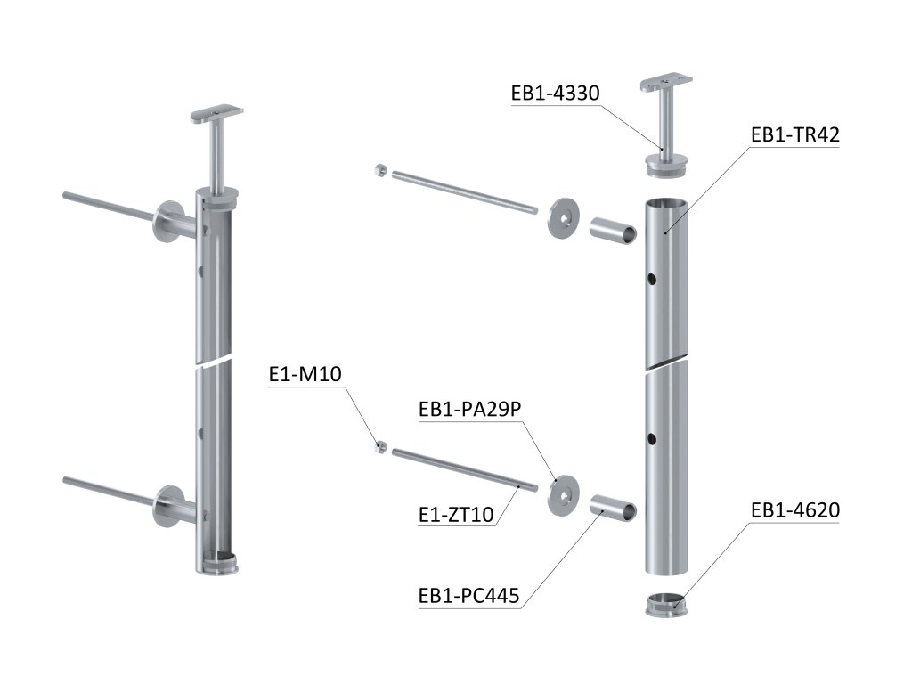 nerezový stĺp na francúzsky balkón, bočné kotvenie, 5 dierový, ľavý, vrch pevný, (ø 42.4x2mm), brúsená nerez K320 /AISI304Dodatočné parametre