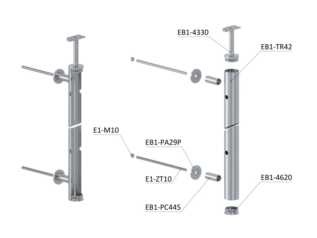 nerezový stĺp na francúzsky balkón, bočné kotvenie, 5 dierový, priechodný, vrch pevný, (ø 42.4x2mm), brúsená nerez K320 /AISI304Dodatočné parametre