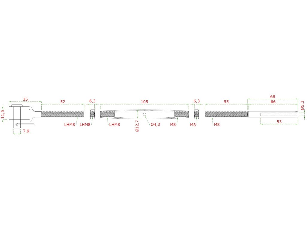 lepiaci úchyt, šponovák pre nerezové lanko ø5mm, so závitom M8 a LH8, brúsená nerez K320/ AISI304Dodatočné parametre