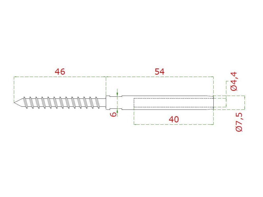 úchyt (lepiaci) pre nerezové lanko ø 4mm so závitom do dreva, ( ø 7mm / L: 100mm), brúsená nerez K320 /AISI316, použiť lepidlo MD-GEL454/20