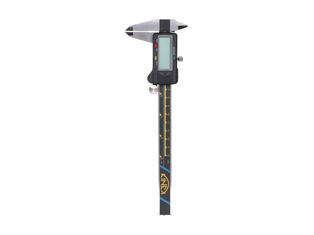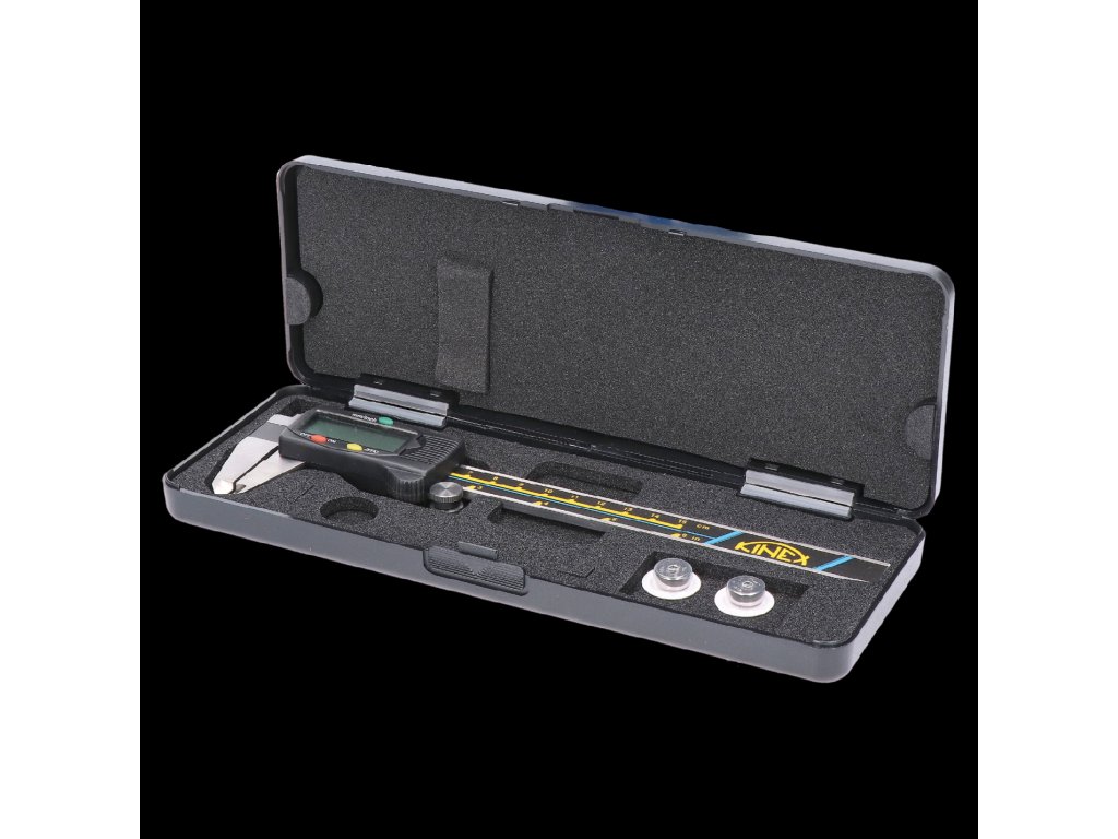 Digitálne posuvné meradlo KINEX 150 mm, 0,01mm, ramená 40 mm, DIN 862, BIG DISPLAY, s hornými nožmi.Pri vypnutí a zapnutí treba priehľadné vedenie skalibrovať "zcvaknout čeľuste na 0mm a vynulovať displej", tým sa docieli správneho merania pri každej sérii.