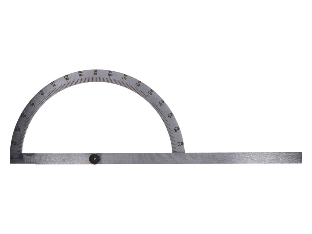 Robustný oblúkový uhlomer z nehrdzavejúcej ocele s rozsahom 0–180°. Rameno s rozmermi 250 × 400 mm je určené pre väčšie diely, kde je dôležitá vysoká presnosť merania a nastavovania uhlov.