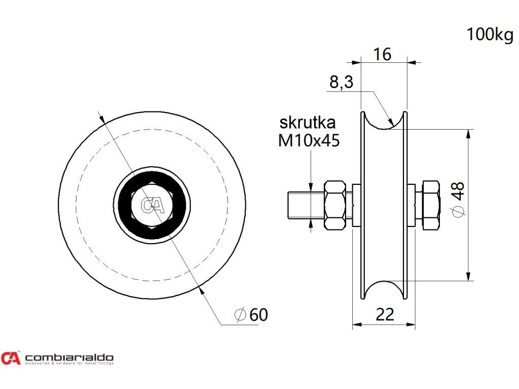 Vodiace koliesko ø 60mm jednoložiskové Combi Arialdo, pre profil C902/16, nosnost 100kg