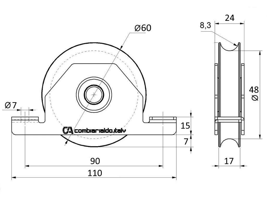 Vodiace koliesko ø 60mm pre zapustenie do jokla Combi Arialdo, pre profil C902/16, nosnosť 100kg