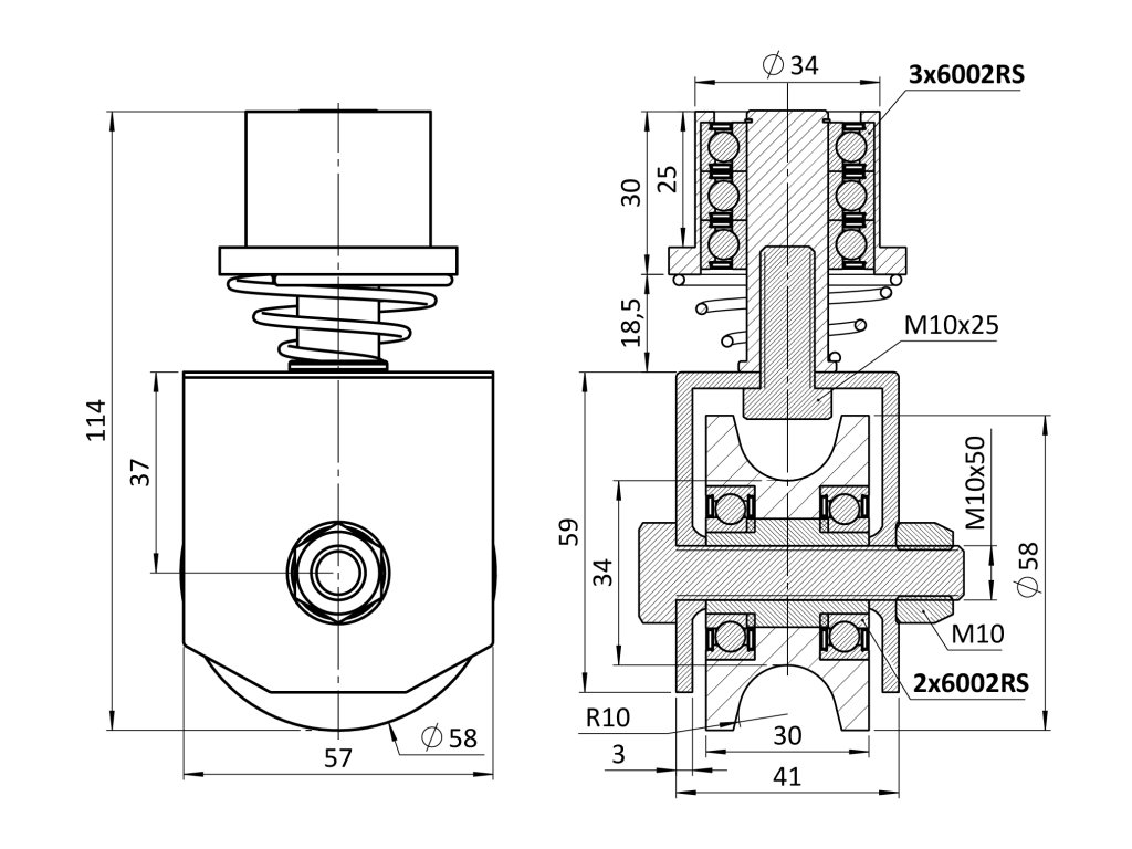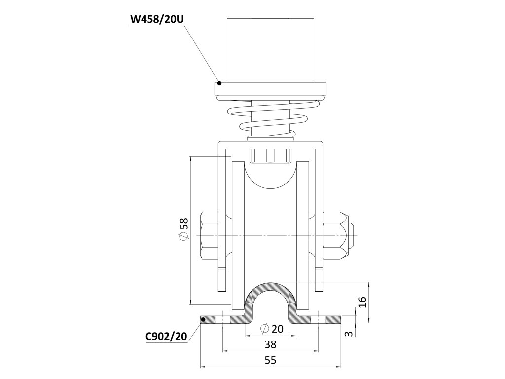 Otočné vodiace koliesko 58mm, pre U profil ø20mm