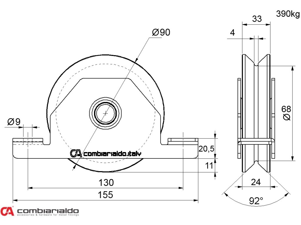 Vodiace koliesko ø 90mm pre zapustenie do jokla dvojložisková Combi Arialdo, V profil, nosnosť 390kg