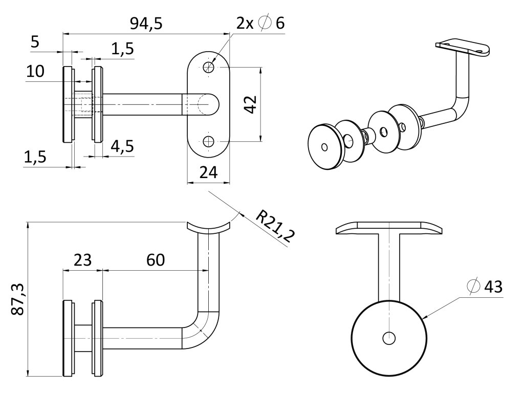 držiak madla so skrátenou vzdialenosťou od skla - pevný na trubku ø 42.4mm, s uchytením na sklo 6-16mm, brúsená nerez K320 /AISI304