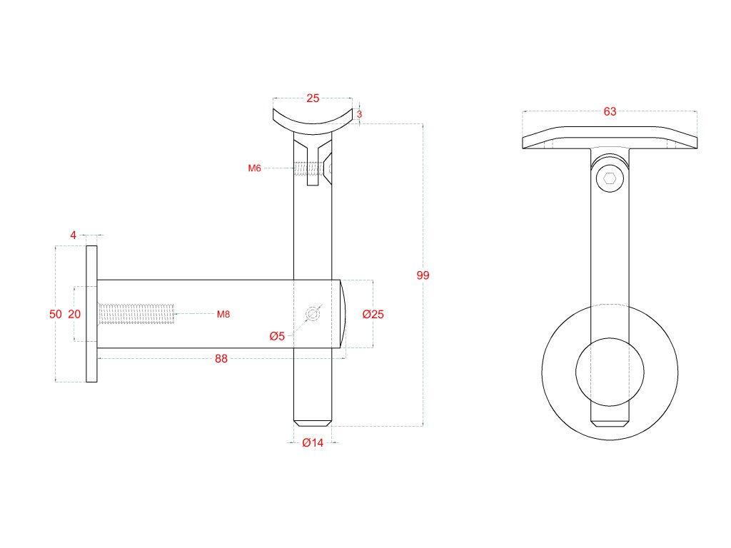 držiak madla s kĺbom /ploché uchytenie na stenu M8 / madlo ø42.4 mm, brúsená nerez K320/AISI304