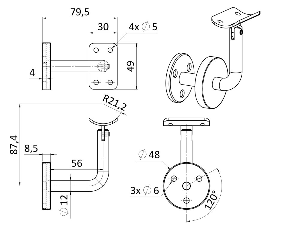 držiak madla so skrátenou vzdialenosťou od steny - nastaviteľný, na trubku ø 42.4mm s krytkou, brúsená nerez K320 /AISI304