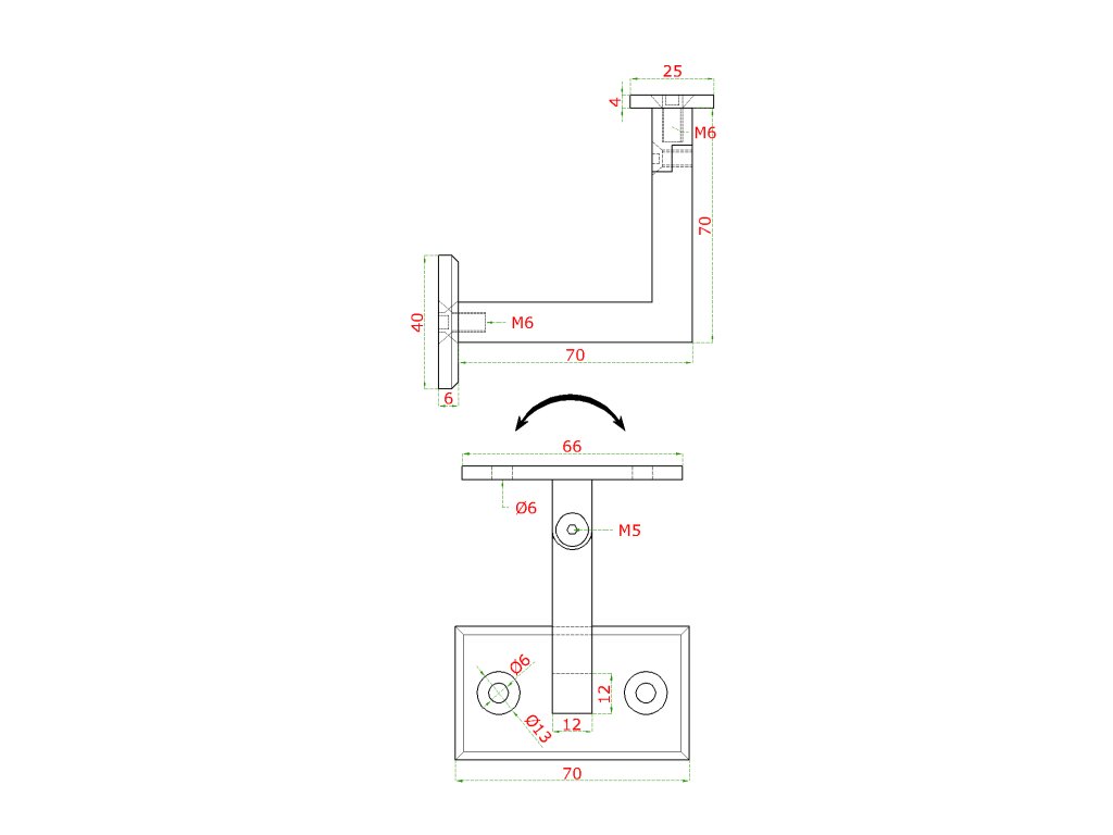 držiak madla na stenu nastaviteľný (plochý, L: 70x70mm, kotviaca doska: 70x40mm), brúsená nerez K320 /AISI304Dodatočné parametre