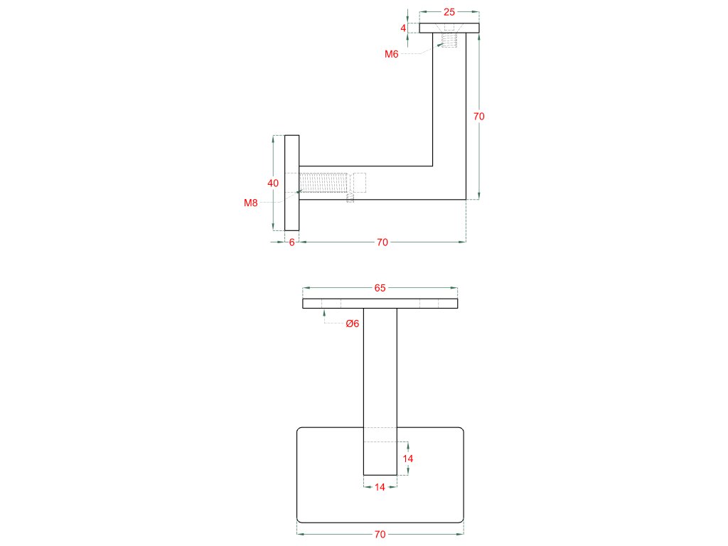držiak madla na stenu pevný, so závitom M8, (plochý, L: 70x70mm, kotviaca doska: 70x40mm), brúsená nerez K320 /AISI304