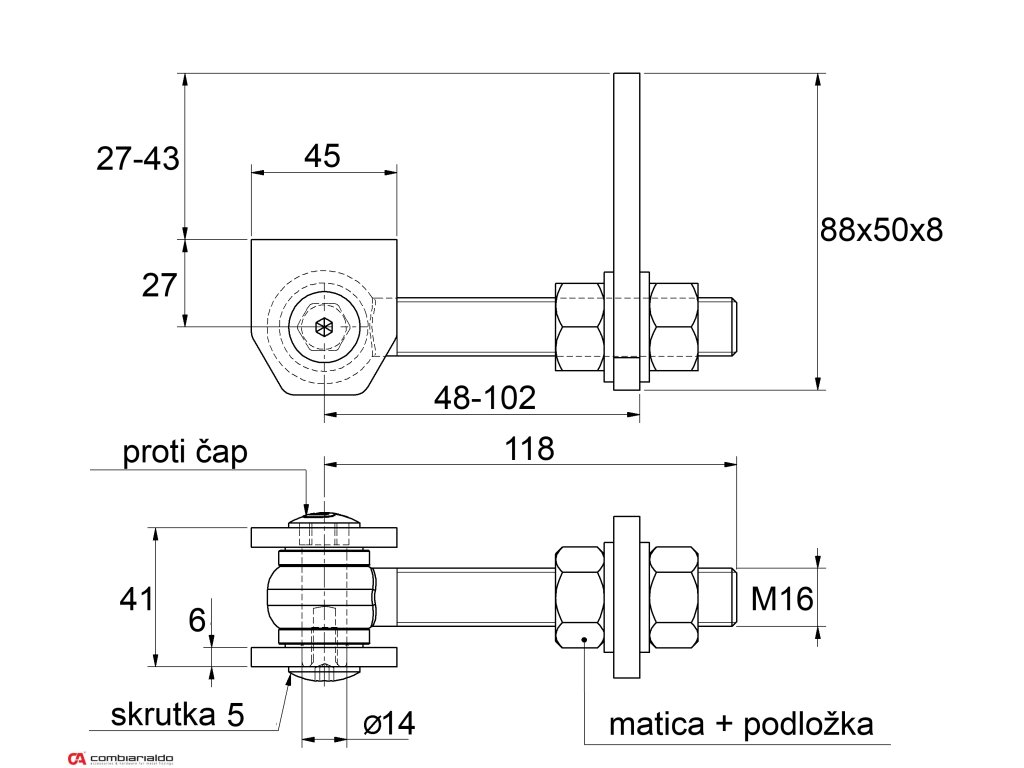 Combi Arialdo navárací záves M16, otvárateľný 180°, nastaviteľný 2D, čiastočne pozinkovaný